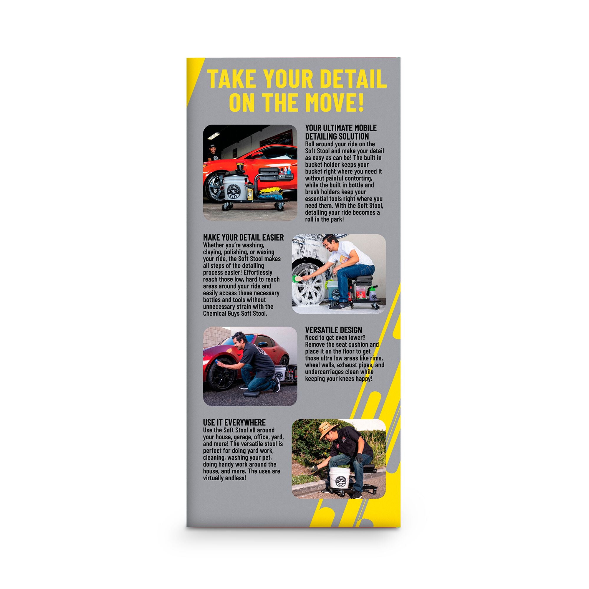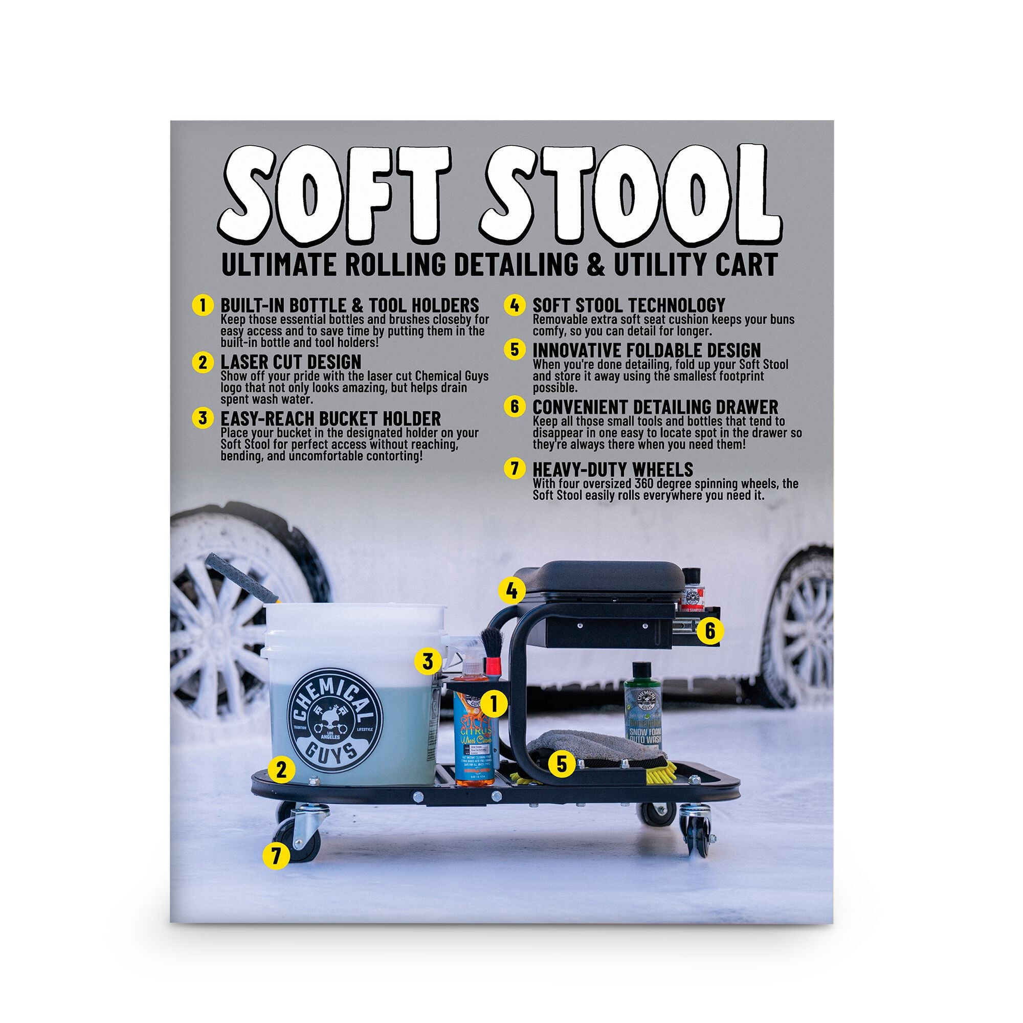 The Soft Stool Ultimate Rolling Detailing & Utility Cart is the hyper functional and ultra comfortable supreme mobile detailing stool and station that makes even the most time consuming jobs a piece of cake.